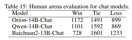 "승리(Win)", "무승부(Tie)", "패배(Loss)"로 평가합니다. 총 14명의 사람이 3,562개의 질문을 평가했다.비교 모델은 Orion-14B-Chat, Qwen-14B-Chat, Baichuan2-13B-Chat이다. 표 15에 나타난 바와 같이, Orion-14B-Chat은 가장 많은 "승리" 표를 받아 인간 평가에서 뛰어난 성과를 입증한다.