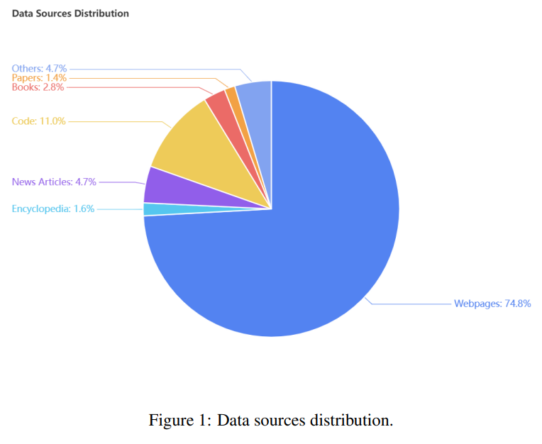 - 초기 단계 (0 ~ 600억 토큰): 웹 페이지와 뉴스 기사 등 일반 지식을 포함한 데이터 사용. 주요 언어는 영어와 중국어.