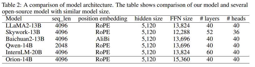 - Orion-14B-Long: 이 모델은 200,000 토큰 이상의 긴 문맥 길이에 최적화되어 있으며, 긴 문맥 평가 세트에서 독점 모델과 유사한 성능을 보여준다 (Bai et al., 2023b; Dacheng Li and Zhang, 2023).
