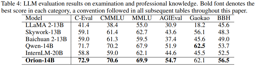대부분의 벤치마크에서 뛰어나지만, Gaokao 평가에서는 Qwen-14B에 약간 뒤처다. 이러한 결과는 Orion-14B가 복잡하고 전문적인 작업에 대해 매우 경쟁력 있고 강력한 모델임을 보여준다.