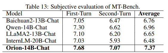 표 13과 표 14에 제시된 결과는 주관적 평가에서 Orion-14B-Chat의 성능을 강조한다. MT-Bench 평가에서 Orion-14B-Chat은 다른 모델들을 현저히 능가하여, 첫 번째 턴과 두 번째 턴 평가에서 모두 최고 점수를 기록하며 평균 점수는 7.37에 달했다. Orion-14B-Chat이 중국어 이해, 작문, 역할 수행, 전문 과제에서 특히 뛰어난 성과를 보였습니다. 이러한 결과는 다양한 대화 맥락에서 경쟁력 있는 성능을 입증한다.