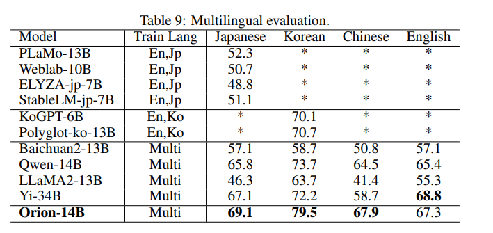 이 논문에서는 Orion-14B 모델에 대해 소개를 한다. 이 모델은 약 2.5 trillion (2.5T) token으로 구성되어 있는 다양한 데이터셋으로 훈련되었다. 데이터셋에서는 주요 언어는 영어, 일본어, 한국어가 있으면 나머지 언어들도 섞여있다. 이 모델은 다국어 능력에서 현재 오픈소스로 공개되어 있는 모델 중에서 최고의 성능을 보여주고 있다. 그리고 이 모델을 기반으로 하는 여러 가지 fine-tuned 모델에 대해서도 소개한다.