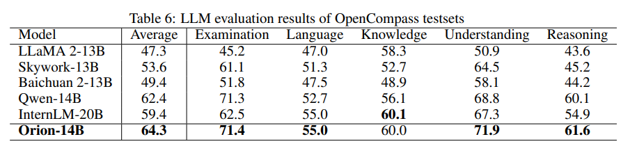 OpenCompass 리더보드에서는 평가 세트가 다섯 가지 카테고리로 구성되어 있다. 각 카테고리에 대한 요약된 결과는 Orion-14B는 평균 점수 64.4%로 가장 좋다. 특히, 시험, 언어, 이해, 추론을 포함한 네 가지 카테고리에서 다른 모델들을 능가하여 뛰어난 분석 및 문제 해결 능력을 나타낸다. 이러한 결과는 Orion-14B가 광범위한 인지 및 언어 작업에서 견고한 능력을 보유하고 있음을 시사한다.