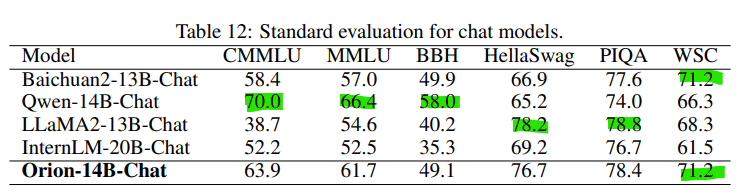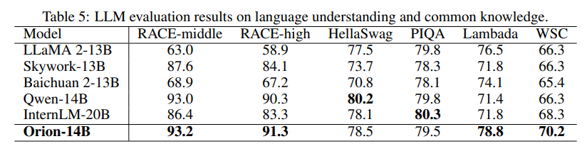 HellaSwag, PIQA, WSC 작업에서는 Qwen-14B와 InternLM-20B에 약간 뒤처진다. 전반적으로, 결과는 Orion-14B가 다양한 자연어 이해 벤치마크에서 강력한 능력을 갖추고 있음을 나타낸다.