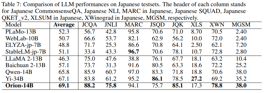 일본어 벤치마크 데이터셋에서 좋은 성능을 나타냄 특히 34B 모델보다 대체적으로 좋은 성능을 나타낸다.