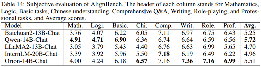 표 13과 표 14에 제시된 결과는 주관적 평가에서 Orion-14B-Chat의 성능을 강조한다. MT-Bench 평가에서 Orion-14B-Chat은 다른 모델들을 현저히 능가하여, 첫 번째 턴과 두 번째 턴 평가에서 모두 최고 점수를 기록하며 평균 점수는 7.37에 달했다. Orion-14B-Chat이 중국어 이해, 작문, 역할 수행, 전문 과제에서 특히 뛰어난 성과를 보였습니다. 이러한 결과는 다양한 대화 맥락에서 경쟁력 있는 성능을 입증한다.