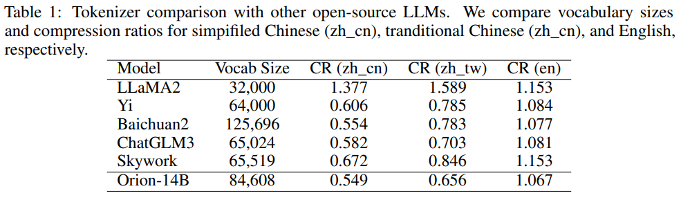 이 모델은 다국어를 사용하기 때문에 여러 언어에서의 word-level 과 subword-level을 필요로 한다. 그래서 여기서 byte-pair encoding (BPE) 알고리즘으로 구현된 SentencePiece를 이용한 Tokenizer를 만들었다. 이 Toeknizer는 99.99% 문자를 다룰 수 있다. 다양한 코퍼스를 구축하고 우리의 훈련 데이터 분포에 맞추기 위해, 우리는 훈련 코퍼스에서 다양한 유형의 텍스트를 선별합니다. 여기에는 영어, 간체 중국어, 번체 중국어, 일본어, 한국어, 몇몇 다른 언어, 그리고 희귀한 문자들이 포함된다. 표 1에서는 우리의 토크나이저와 다른 오픈 소스 토크나이저의 자세한 비교를 제공합니다. 이 비교에는 어휘 사전 크기와 압축 비율(CR)이 포함되며, 후자는 원본 데이터의 크기를 토크나이즈된 데이터의 크기로 나눈 비율로 계산한다.